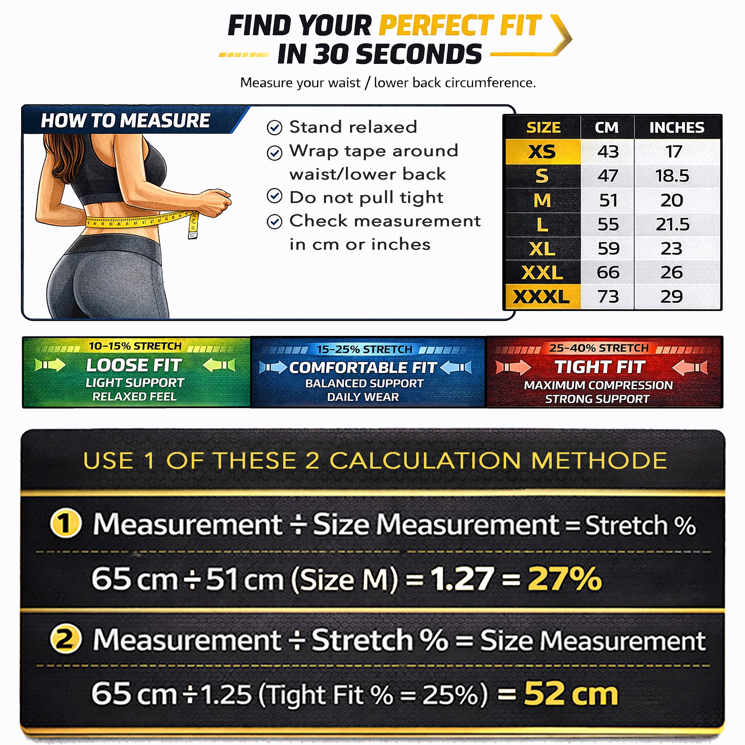 The Back in KontroL Backwarmer is designed to be worn tight and adjusted around the waist. Select the proper size by measuring your waist and removing 3-6inches (7-15cm) in circumference.